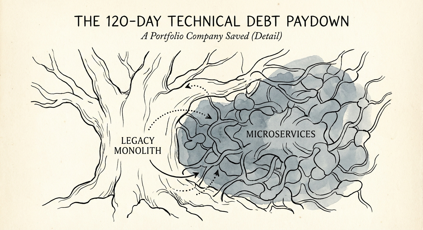 We rejected the CTO's request for a 12-month rewrite. In Private Equity, you don't have 12 months to go dark. Instead, we deployed a 120-day "Paydown Plan" focused on inheriting and fixing the debt without halting operations.