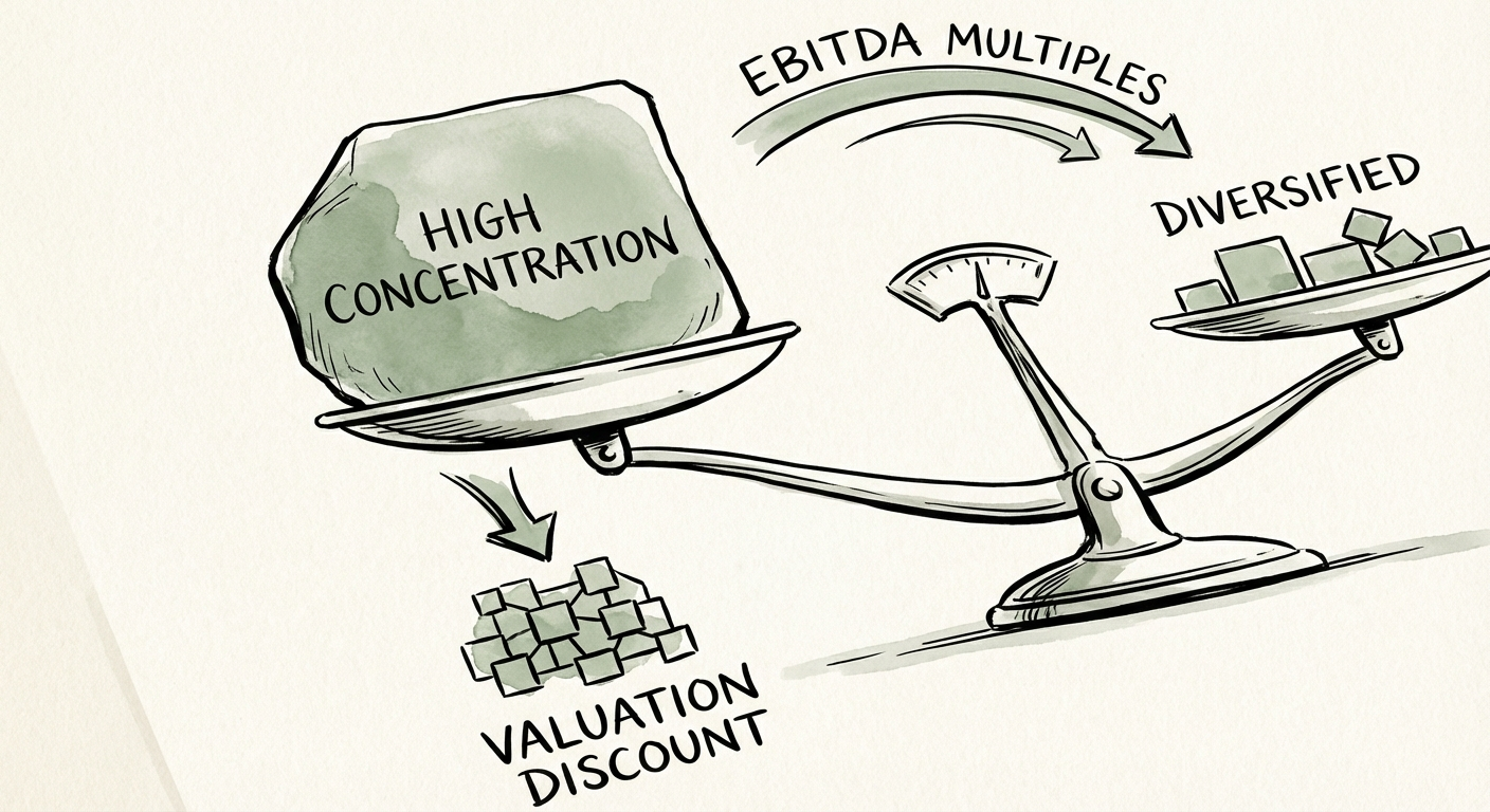 The market data on this is unforgiving. Concentration above 20% with a single customer is the threshold where premium multiples die. According to data from Focus Investment Banking, customer concentration >30% often renders a business unsellable to conventional buyers or triggers valuation discounts of 20-35%. It doesn’t matter if that customer is Amazon or Lockheed Martin; if they sneeze, your portfolio company catches pneumonia.
