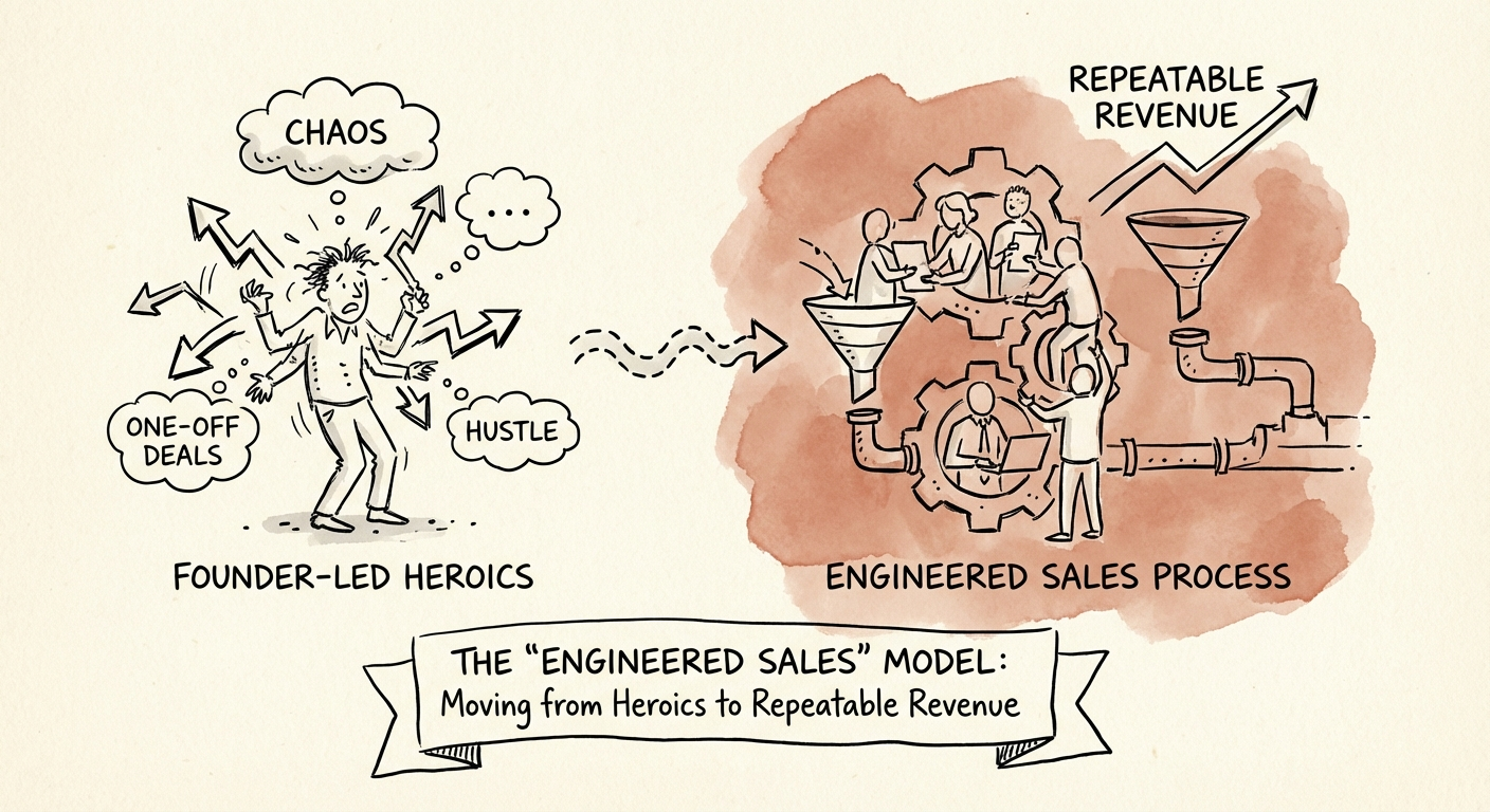 You are likely the best salesperson in your company. If you are a Founder-CEO sitting at $10M-$20M ARR, this isn't a compliment—it's a liability. You built the company on what I call "Heroics": late-night RFPs, charisma-driven pitches, and the sheer force of will that drags a deal across the finish line.