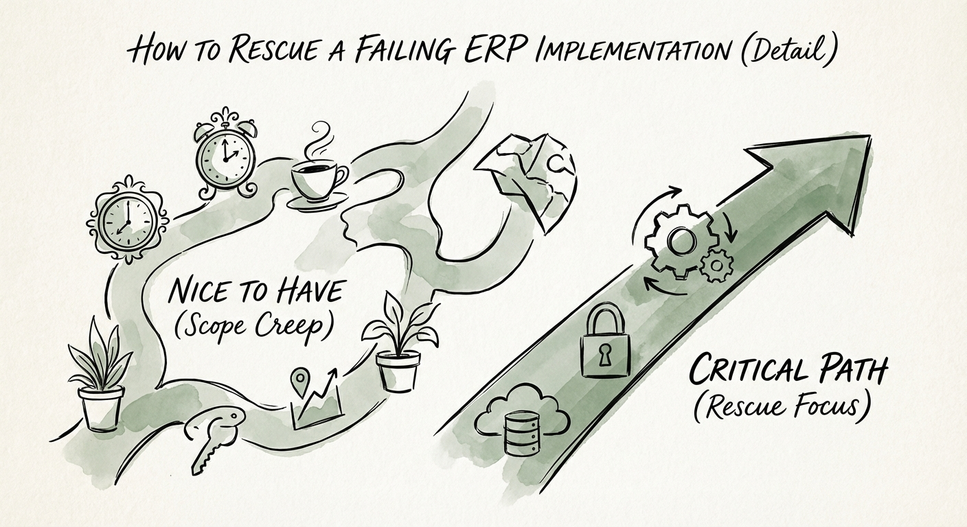 Rescuing an ERP project requires the courage to deliver bad news. You must tell the business: "You aren't getting everything you wanted on Day 1, but you will get a working system that allows us to scale." That is the trade-off that saves careers.