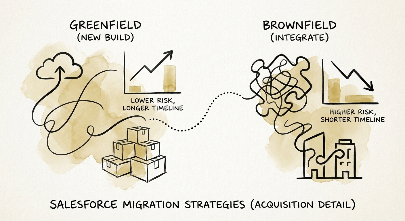 Most consultants will give you a vague "it depends." We look at the Technical Debt Ratio. If your current instance is over 5 years old and heavily customized with Apex code that no one understands, moving an acquired company into it is like adding a new wing to a burning house. In that case, Greenfield is safer. However, for 80% of PE-backed add-ons, a Brownfield approach (merging into the acquirer's instance) is the fastest path to EBITDA impact—if you solve the data hygiene issue first.