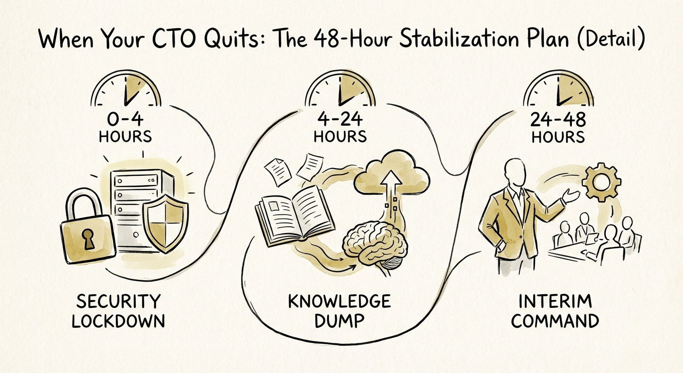 A CTO departure is often a blessing in disguise. It reveals the hidden costs of tribal knowledge and forces you to build systems that survive key people. Use this transition to professionalize your engineering operations.